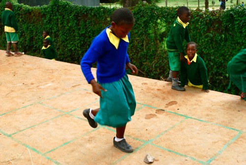 The kids at Ruben play a game called “kaskumu,” similar to what North American kids call “hopscotch.” Four “kaskumu courts” were ground and painted on top of the school’s cemented sewage cap.