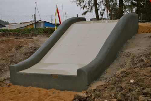 One side of the main play field contained a grove of pine trees and heaps soil also leftover from construction. In one corner, the mason crew constructed a giant cement and tile slide, built into the soil mountain.