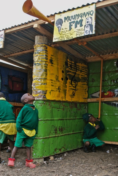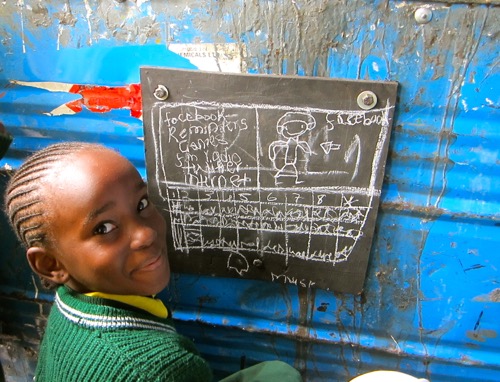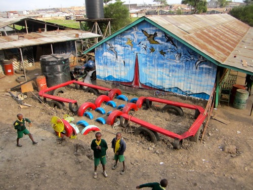 Adjacent to the village, we constructed a kid-sized “town,” where students can take charge of the activities they see in Mukuru through imaginative play. The market stalls were built from recycled oil drums and painted by Ruben’s resident artist, Chris.